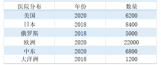 根據(jù)上圖所示,不完全統(tǒng)計(jì)表明2020年美國約有6200家醫(yī)院,歐洲約有22000家,中東約有6800家醫(yī)院,2018年日本有8400家醫(yī)院,大洋洲有1200家醫(yī)院,俄羅斯有5000家醫(yī)院。