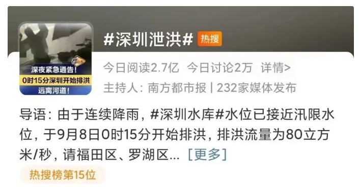 5日-9日,臺風(fēng)“海葵”先后兩次登陸福建、廣東。受其影響,南方多地出現(xiàn)特大暴雨,福建省、廣東省氣象臺多次發(fā)布“暴雨預(yù)警一級”。福州、廈門、漳州、深圳、廣州、佛山等城市內(nèi)澇嚴重,部分城市雨水齊腰,短時間強降雨超過100毫米,深圳降雨量更是打破1953年以來的降雨極值,地鐵灌水,深圳泄洪多次登上各大平臺的熱搜第一。